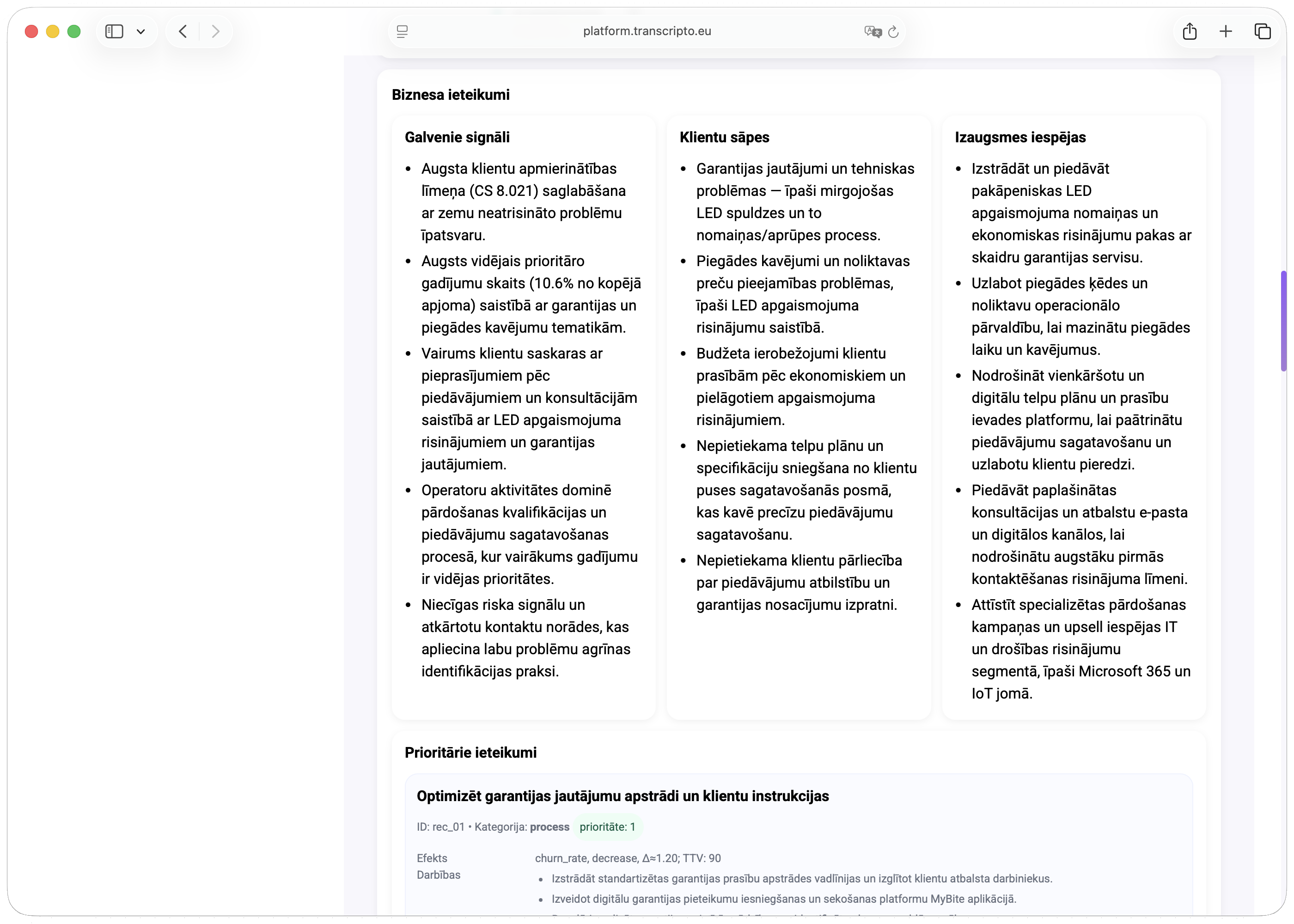 Sistēma automātiski analizē katru zvanu un ziņu, izveidojot strukturētu saziņas karti: saziņas iemesls, klienta nodoms, riska signāli, statuss, SLA/FCR, pamatcēlonis un ieteicamās nākamās darbības uzņēmumam.