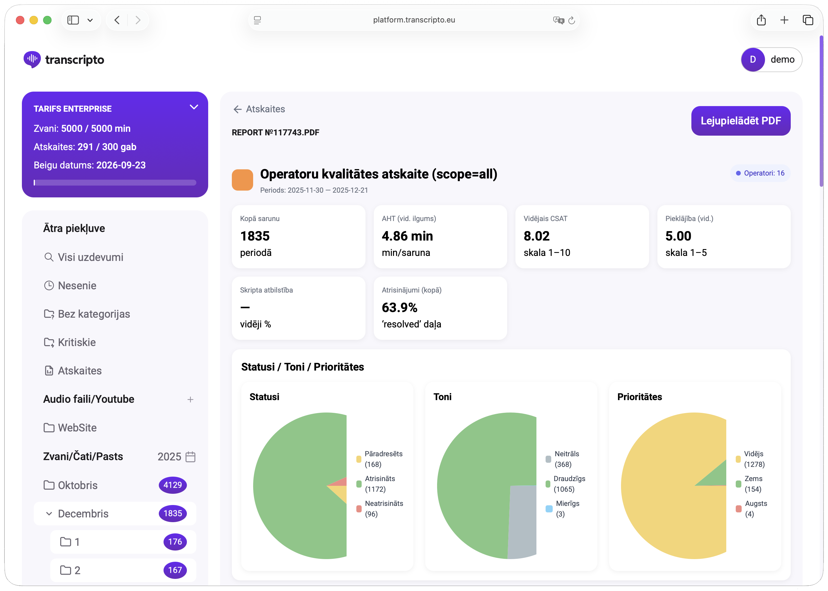 Demonstrācijas laikā parādīsim datu augšupielādi un apstrādi, analītiku un pārskatus, kvalitātes monitoringu, vadības paneli un meklēšanu, ieteikumu piemērus un sapulču kopsavilkumus. Demonstrāciju var veikt ar testa datiem vai ar jūsu reālajām sarunām.